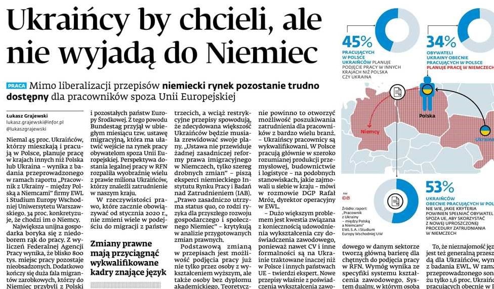 To, że nieznajomość języka jest też generalną przeszkodą dla Ukraińców, wynika z badania EWL. W ramach przeprowadzonego sondażu tylko 1,6 proc. Ukraińców pracujących obecnie w Polsce zna bardzo dobrze język niemiecki, 1,4 proc. – dobrze, a 5,5 proc. – przeciętnie. Natomiast 70 proc. badanych nie zna niemieckiego w ogóle. Brak wymaganego wykształcenia zawodowego i umiejętności językowych będzie barierą nie do przejścia dla większości Ukraińców, którzy podjęli pracę w Polsce ze względu na łatwość legalnego zatrudnienia oraz bliskość językową.