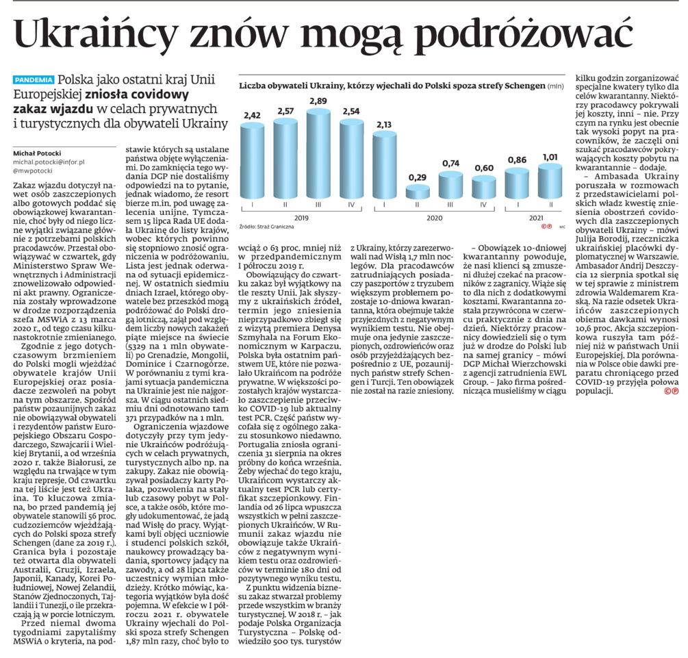 Polska jako ostatni kraj Unii Europejskiej zniosła covidowy zakaz wjazdu w celach prywatnych i turystycznych dla obywateli Ukrainy. Zakaz wjazdu dotyczył nawet osób zaszczepionych albo gotowych poddać się obowiązkowej kwarantannie, choć były od niego liczne wyjątki związane głównie z potrzebami polskich pracodawców. Przestał obowiązywać w czwartek, gdy Ministerstwo Spraw Wewnętrznych i Administracji znowelizowało odpowiedni akt prawny. Ograniczenia zostały wprowadzone w drodze rozporządzenia szefa MSWiA z 13 marca 2020 r., od tego czasu kilkunastokrotnie zmienianego. Czytamy o tym w Dzienniku Gazecie Prawnej.