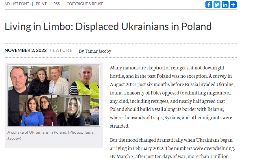 This time, the results of the survey ‘Refugees from Ukraine in Poland’ were published by Migration Policy Institute, the independent think tank in Washington, DC, dedicated to the study of the movement of people worldwide. The article Living in Limbo: Displaced Ukrainians in Poland was written by Tamar Jacoby, president of Opportunity America, a Washington-based nonprofit working to promote economic mobility.