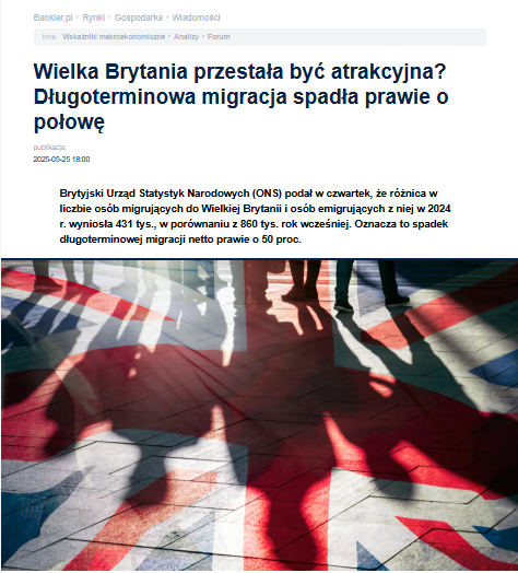 Według danych urzędu różnica w liczbie osób migrujących do Wielkiej Brytanii i osób emigrujących z niej w 2024 roku wyniosła 431 tys., w porównaniu z 860 tys. rok wcześniej. Oznacza to spadek długoterminowej migracji netto prawie o 50%.