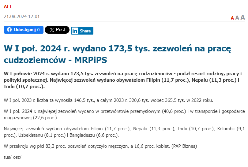 W I połowie 2024 roku wydano 173,5 tys. zezwoleń na pracę cudzoziemców – poinformowała 21 sierpnia Polska Agencja Prasowa, powołując się na dane MRPiPS.