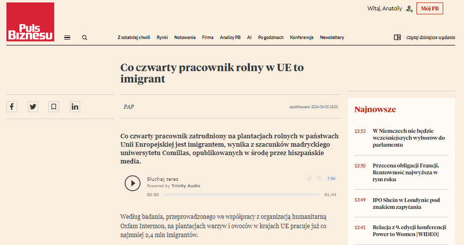 Co czwarty pracownik zatrudniony na plantacjach rolnych w państwach Unii Europejskiej jest imigrantem – poinformował 5 czerwca Puls Biznesu, powołując się na badanie madryckiego uniwersytetu Comillas.