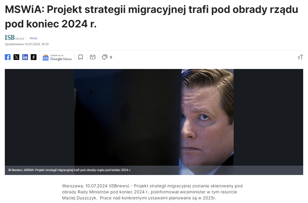 Projekt strategii migracyjnej zostanie skierowany pod obrady Rady Ministrów pod koniec 2024 roku – poinformował wiceminister Maciej Duszczyk, cytowany 10 lipca przez portal Investing.com.