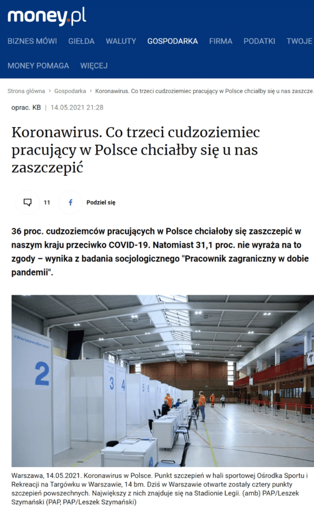 36% cudzoziemców, którzy wzięli udział w badaniu socjologicznym “Pracownik zagraniczny w dobie pandemii” zadeklarowało chęć zaszczepienia się w Polsce przeciwko COVID-19 – poinformował 14 maja portal Money.pl, powołując się na badanie przeprowadzone przez EWL Group oraz Studium Europy Wschodniej Uniwersytetu Warszawskiego.
