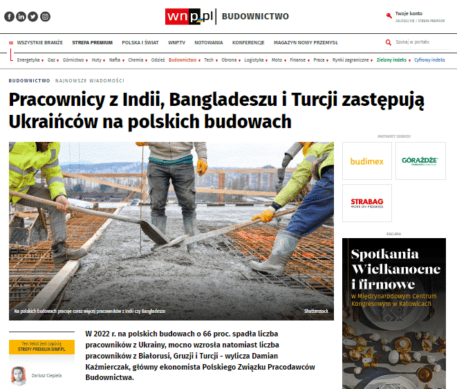 Damian Kaźmierczak, główny ekonomista Polskiego Związku Pracodawców Budownictwa, powołując się na dane Ministerstwa Rodziny i Polityki Społecznej zauważa, że spadek liczby pracujących cudzoziemców w polskim sektorze budownictwa wynika głównie z hamowania rodzimego budownictwa i mniejszego zapotrzebowania na pracowników ogółem.