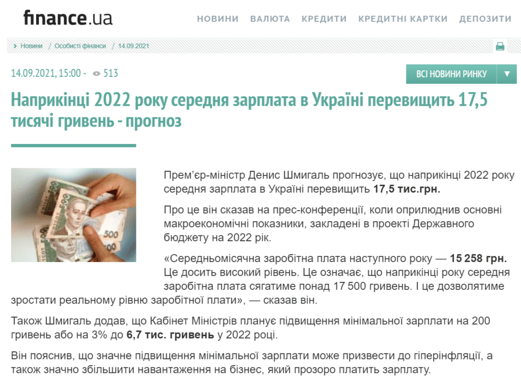 W ślad za wzrostem PKB idą optymistyczne prognozy dotyczące średniego wynagrodzenia na Ukrainie. Zgodnie z zapowiedziami premiera Denysa Szmyhala pod koniec 2022 roku powinno ono przekroczyć 17 500 hrywien, czyli około 2 576 złotych (obecnie wynosi 14 345 hrywien albo około 2 112 złotych). Z kolei minimalna pensja na Ukrainie w październiku 2022 roku ma sięgnąć 6 700 hrywien, czyli około 986 złotych (obecnie wynosi 6 000 hrywien, czyli około 883 złotych).