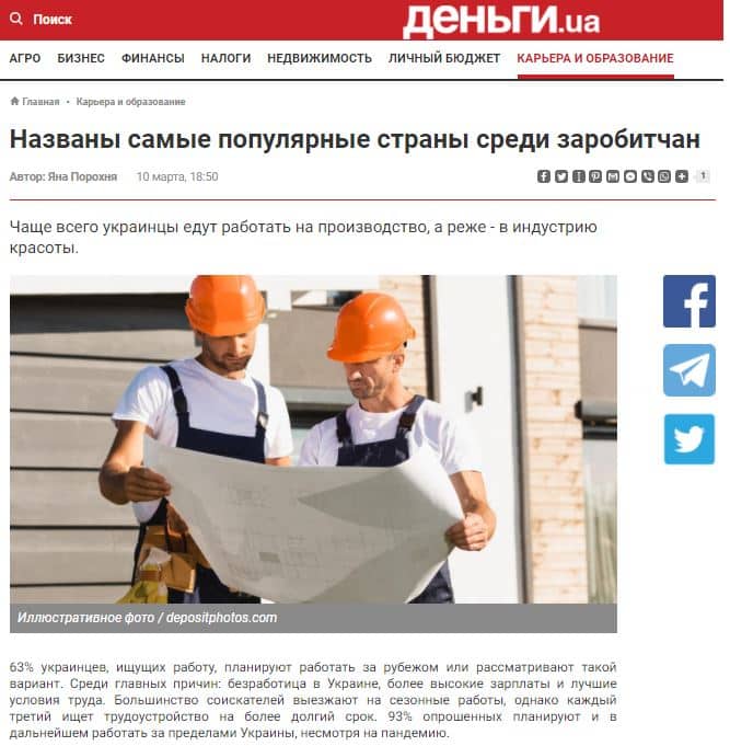 Wybierając kraj docelowy migracji zarobkowej, pracownicy z Ukrainy preferują państwa UE: Polska – 50%; Czechy – 11%; Niemcy – 9%; Litwa – 2% oraz Słowacja – 1,5%. Większość Ukraińców poszukujących zatrudnienia za granicą wybiera pracę sezonową, zaś 1/3 poszukuje ofert na dłuższy okres.