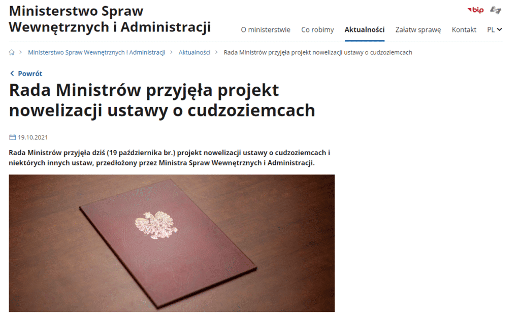 Rada Ministrów 19 października przyjęła projekt nowelizacji ustawy o cudzoziemcach i niektórych innych ustaw, przedłożony przez Ministra Spraw Wewnętrznych i Administracji – czytamy na oficjalnym portalu MSWiA.