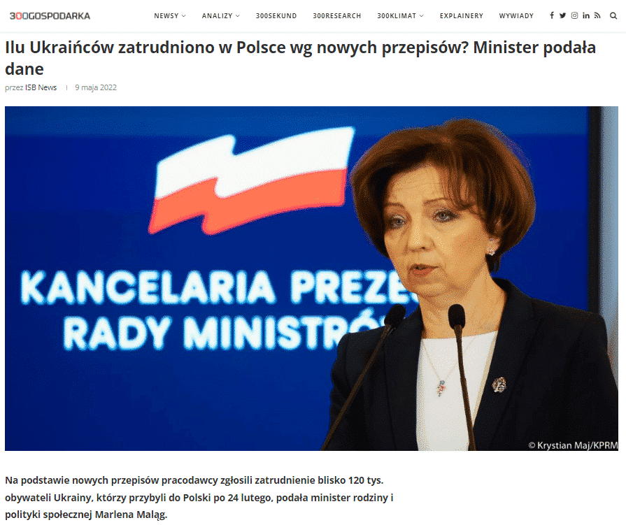 Na mocy specustawy o pomocy obywatelom Ukrainy w Polsce pracę w naszym kraju znalazło już blisko 120 tys. obywateli Ukrainy. Poinformował o tym 9 maja portal 300gospodarka.pl powołując się na najnowsze dane Ministerstwa Rodziny i Polityki Społecznej.